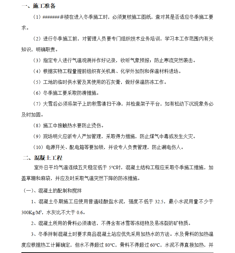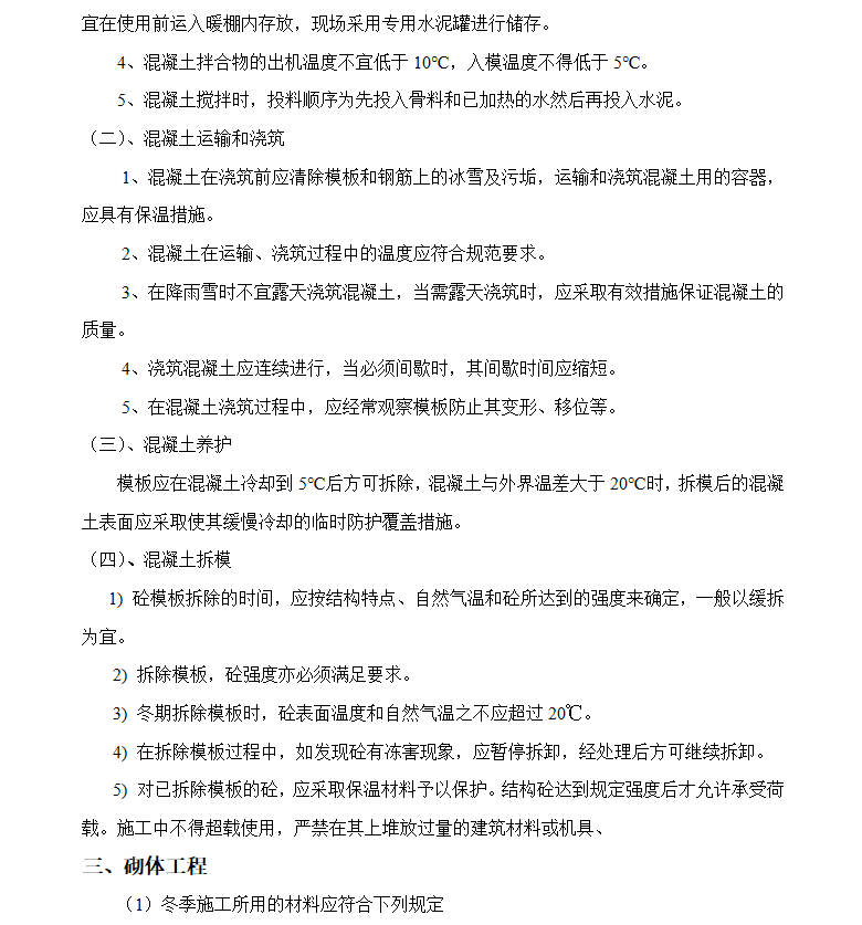 混凝土冬期施工应使用普通硅酸盐水泥,强度不低于32.5,最小水泥用量不少于300Kg/M3,水灰比不大于0.6。冬季拌制混凝土时要求商品混凝土站应优先采用加热水的方法。水及骨料的加热温度应根据热工计算确定,但水不得超过80℃,骨料不得超过60℃,水泥不得直接加热,并宜在使用前运入暖棚内存放,现场采用专用水泥罐进行储存。
