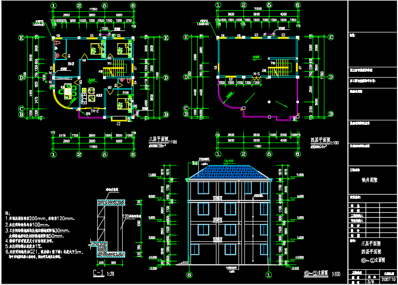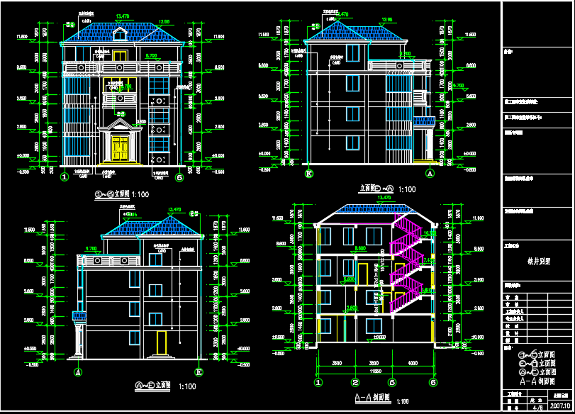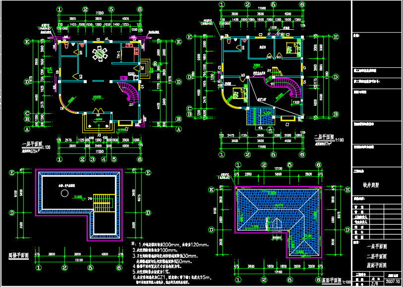 四层框架结构别墅施工图纸包括:一层平面图、二层平面图、屋面平面图、三层平面图、四层平面图、立面图、剖面图、立面门廊大样图、楼梯大样图、大样图。