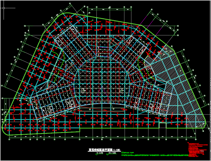 异性钢结构图纸,地上三层,地下一层,有设备夹层,地下为混凝土结构,地上为钢结构,包括首层梁配筋平面图、二层结构平面图、二层夹层结构平面图、三层结构平面图、屋面层结构平面图、首层楼板配筋平面图、二层结构模板和板配筋平面图、二层夹层结构模板和板配筋平面图、三层结构模板和板配筋平面图、地下室墙柱布置平面图、首层楼板配筋平面图