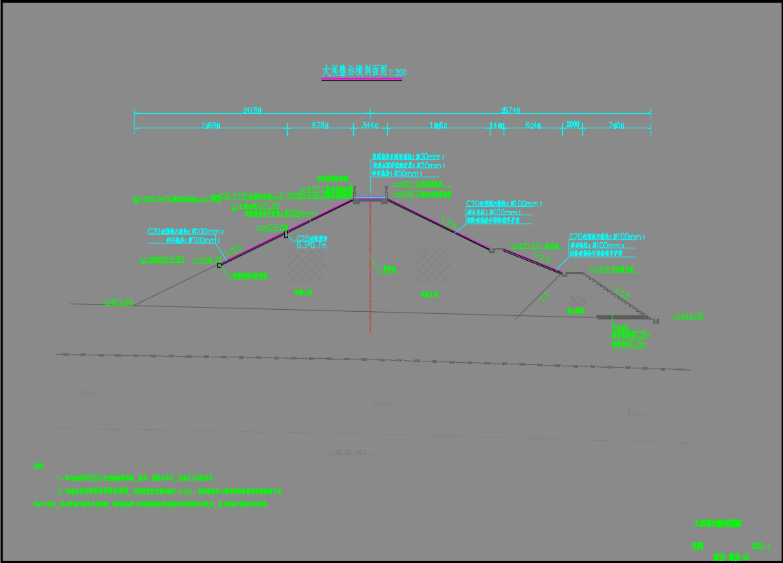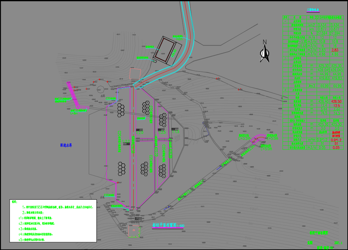 水库坝址以上控制流域面积0.434km2,主河道长0.877km,河道平均比降为27.594‰。跃进水库大坝为均质土坝,坝轴线长74.50m,最大坝高12.50m(整治后),坝顶宽3.44m,最大坝底宽55.78m,坝顶高程426.50m。水库校核洪水位426.275m(本报告中高程均为黄海高程,下同),设计洪水位426.045m,正常蓄水位425.30m,死水位419.83m;总库容44.99万m3,正常库容24.30万m3,死库容8.20万m3。水库三查三定资料及原设计整治资料复查后有效灌面300亩。